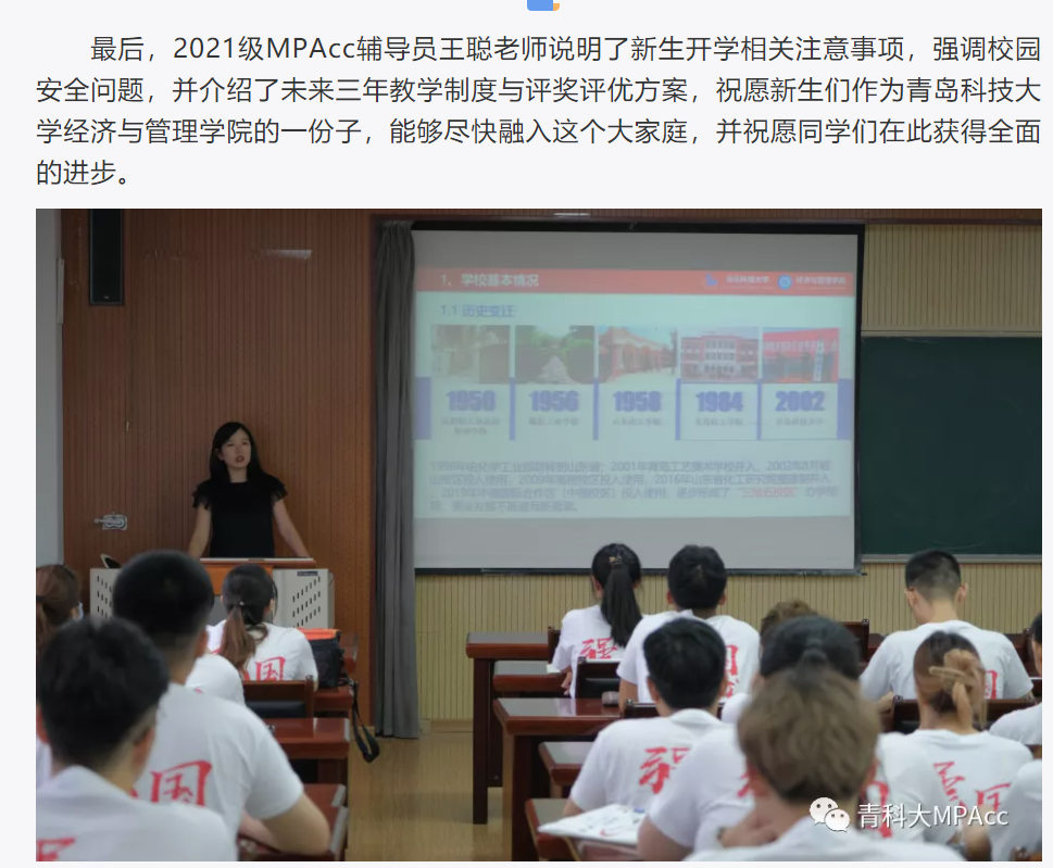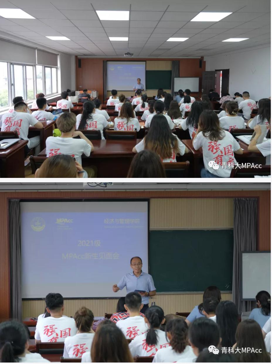 接着由MPAcc中心主任于培友老师为新生们介绍青岛科技大学MPAcc培养目标、培养方式、培养特色,并向同学们说明未来三年大致的教学规划与安排。于培友老师向新生们传达了青岛科技大学MPAcc教育中心贯穿以人为本的教育理念,全员育人、全方位育人,毕业学生大多进入知名企业、银行、事务所,明确了青岛科技大学MPAcc项目优势所在,他鼓励同学们多学、多问、多感悟,不断提升自身的同时凝聚更为雄厚的“青科大MPAcc”品牌力量。至此